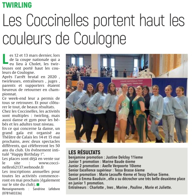 Les Coccinelles ont fièrement défendu les couleurs de notre commune les 12 et 13 mars derniers à Cholet lors de la Coupe Nationale Individuelle de Twirling. Il faut saluer la jolie place d'Emma Bauduin qui se classe 2ème en catégorie promotion. Merci aux entraineurs et aux juges pour leur dévouement !!